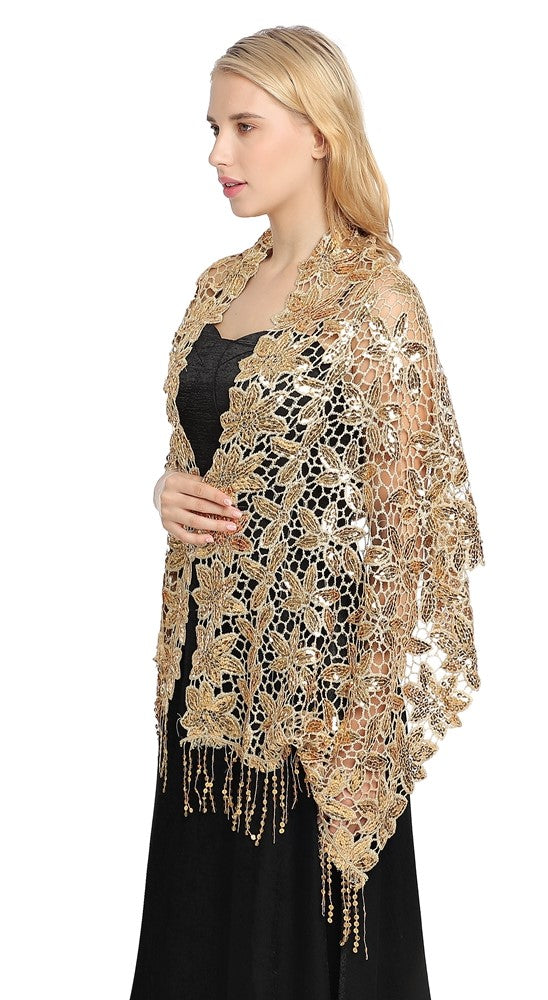 • Sparkly gold sequin pashmina in a pretty floral motif with finished with sequin tassels