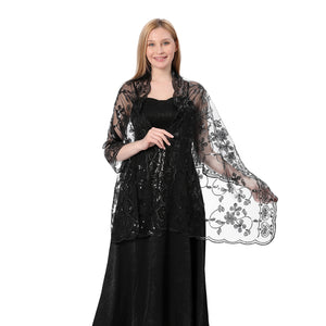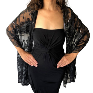 This vintage-inspired black evening wrap, black sequin shawl, creates beautiful evening party glamour - its black sequins shimmer in the light. A true eye catcher! The sheer fine net fabric is embroidered in a sequined pattern of flowers with scalloped sequined borders, this black sequin scarf shawl will bring elegant sparkle to your Christmas party, evenings out, wedding outfit. The vintage styling of this embroidered scarf create a 1920's and 1930's, Great Gatsby, Downton Abbey, fabulous-and-fun-while-still-elegant-aura; making sure this sequin shawl will give your evening that extra sparkle. If you are looking for a sequin shawl for a formal event, a wedding, gala, ball, office party, Christmas party or just a night out, this sequin wrap will set off your ensemble with vintage elegance and classic style. Perfect for yourself or as a gift for someone else. Colour - Black